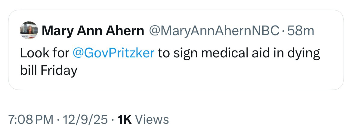 According to NBC political reporter Mary Ann Ahern, Gov. Pritzker is expected to sign SB 1950 on Friday, as reported on her X account.