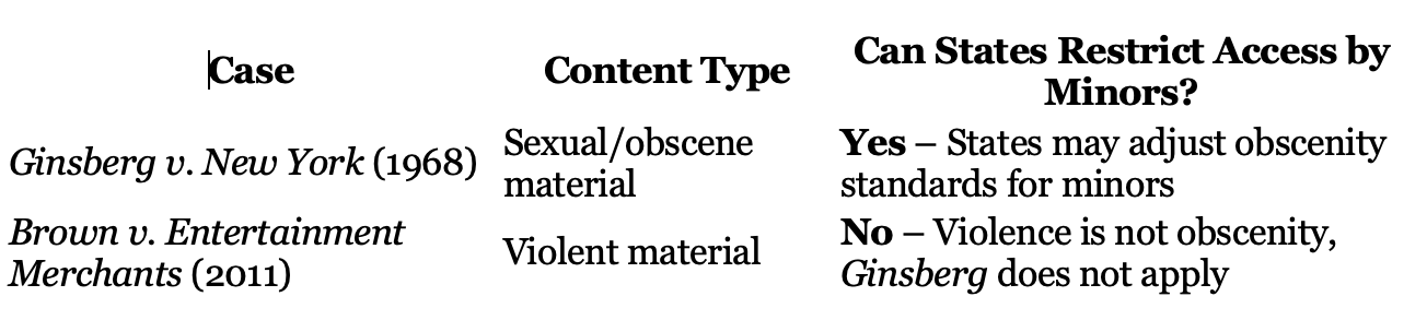 The Brown decision states that violent content cannot be restricted because it is not considered obscenity. Still, sexual content can be restricted under Ginsberg because it is considered obscenity when it involves minors.