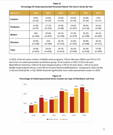 Netflix also enforces extreme DEI policies and their Inclusion and Diversity Report shows their celebration of their growing number of underrepresented directors and lead characters.
